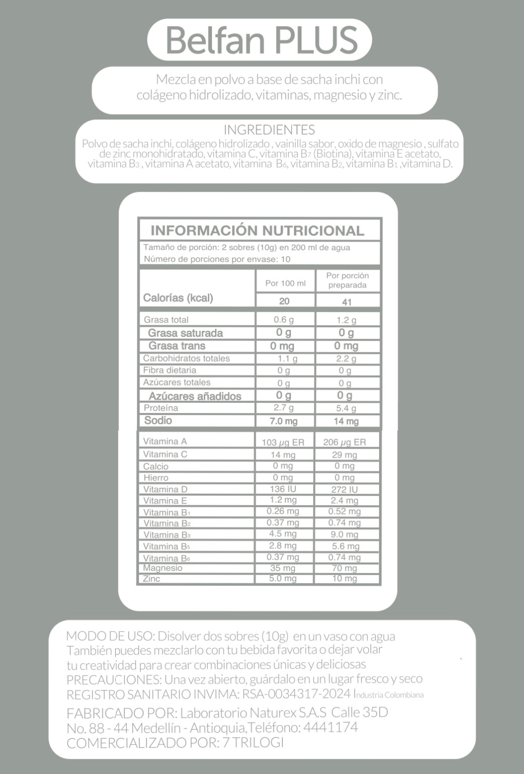 Mezcla funcional de Sacha Inchi y péptidos de colágeno hidrolizado SIN sabor NI BIOTINA, adicionado con Vitaminas A, B1, B2, B3, B6, C, D, E, Magnesio y Zinc.