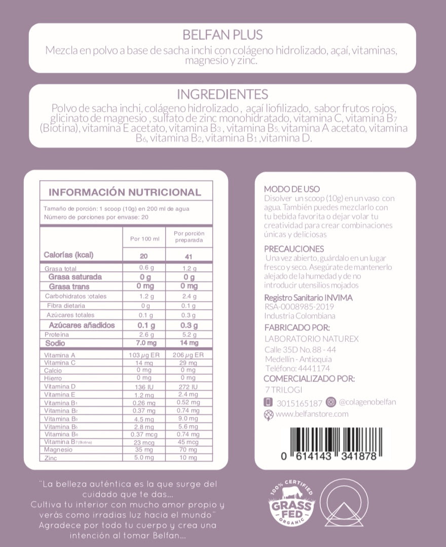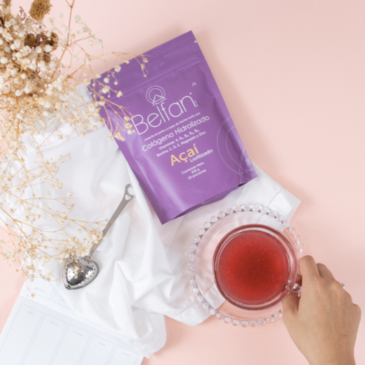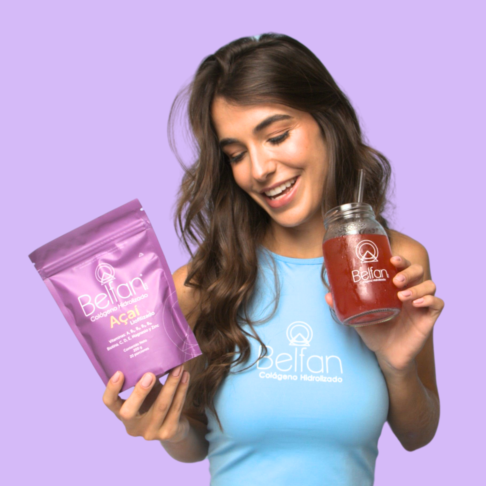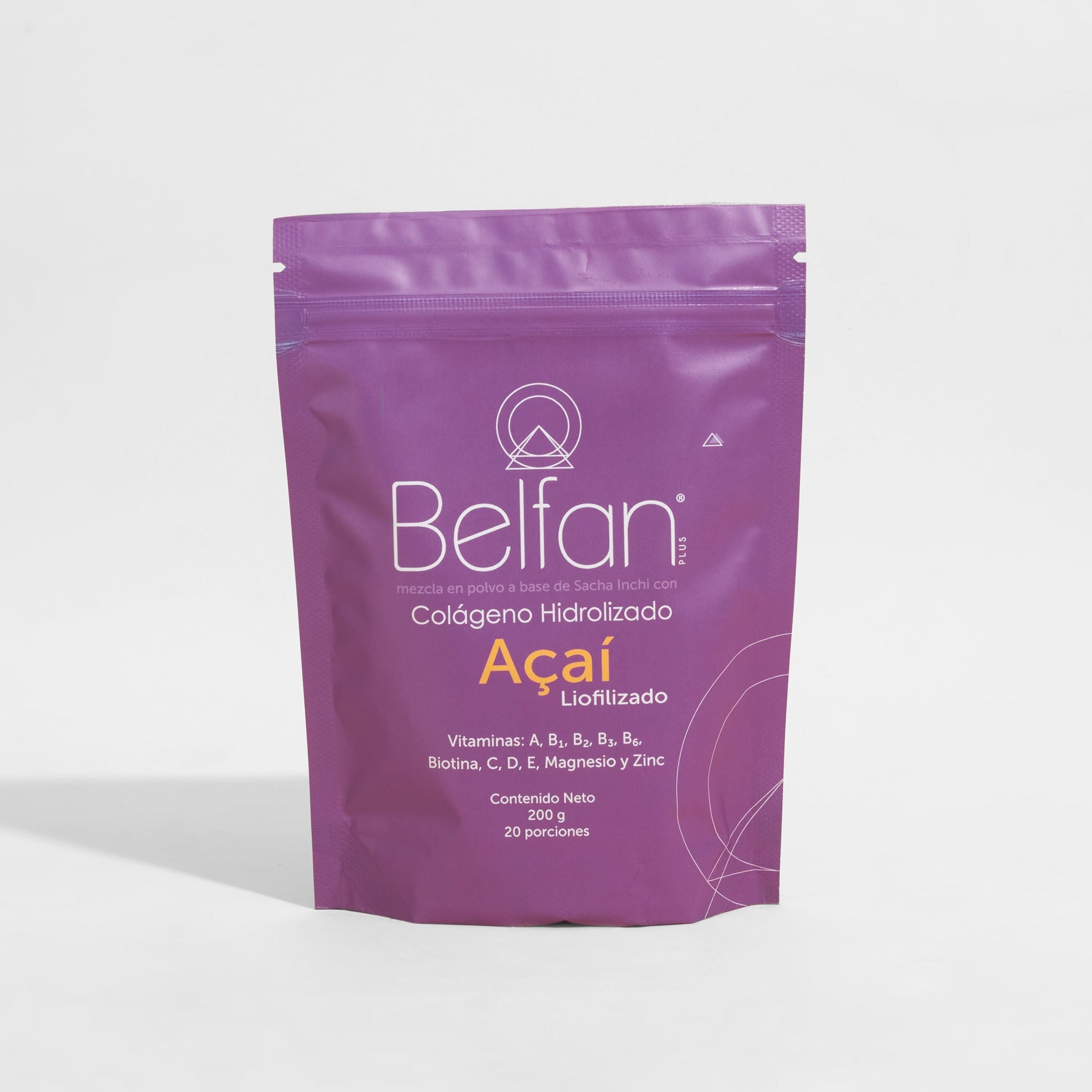 Belfan AÇAÍ es ideal para ti, gracias a la combinación del colágeno, las vitaminas, los minerales y los TROZOS DE AÇAÍ LIOFILIZADOS (proceso que mantiene la gran mayoría de vitaminas y minerales de este poderoso fruto amazónico) para ayudarte en procesos de digestión, subir defensas y eliminar radicales libres de tu piel