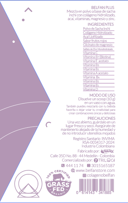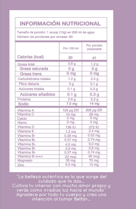Belfan AÇAÍ es ideal para ti, gracias a la combinación del colágeno, las vitaminas, los minerales y los TROZOS DE AÇAÍ LIOFILIZADOS (proceso que mantiene la gran mayoría de vitaminas y minerales de este poderoso fruto amazónico) para ayudarte en procesos de digestión, subir defensas y eliminar radicales libres de tu piel
