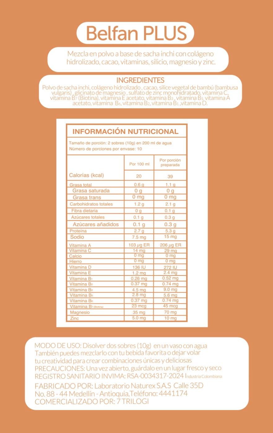 Mezcla funcional de Sacha Inchi, péptidos de colágeno hidrolizado, cacao orgánico y silicio adicionado con Vitaminas A, B1, B2, B3, B6, C, D, E, Biotina, Magnesio y Zinc.